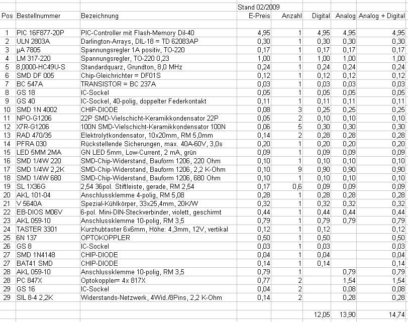 Bauteilliste (Stand 03/2009) (als CSV ) (Änderung / Irrtum vorbehalten)