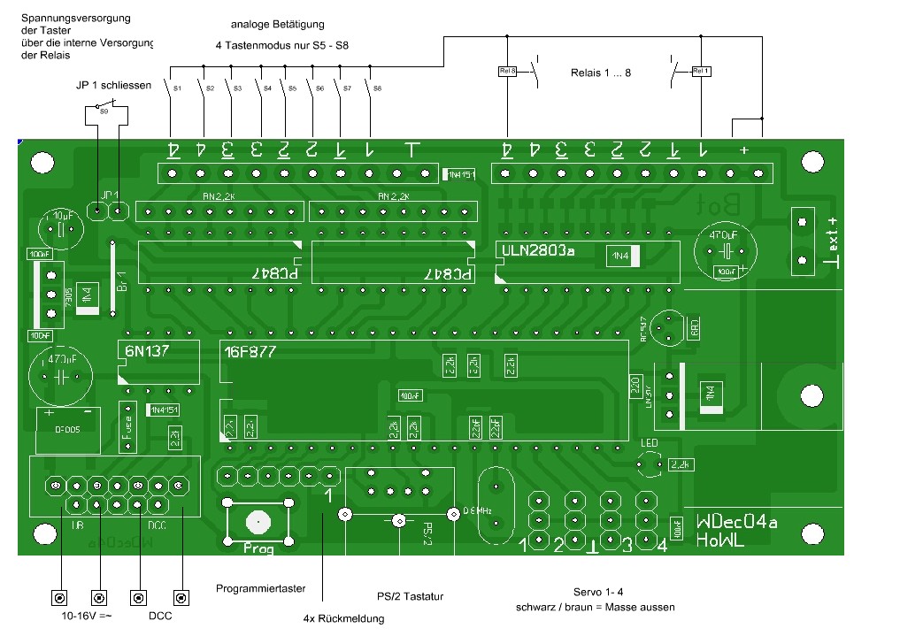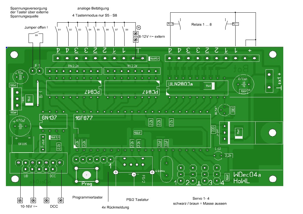 - analoge Ansteuerung über 8 oder 4 Taster (toggeln), galvanisch über Optokoppler getrennt